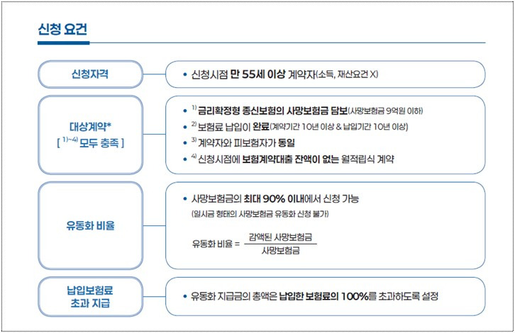 유동화 신청 자격은 만 55세 이상인 보험 계약자여야 하며, 보험 계약은 최소 10년 이상 유지되어야 합니다. 또한, 보험료가 완납되어 있어야 하며, 신청자와 피보험자가 동일해야 합니다. 이러한 조건을 충족하면 유동화를 신청할 수 있습니다.