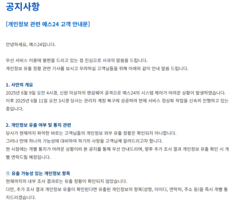 [3] 조선일보 - 개인정보위, 예스24 개인정보 유출 조사 착수 (https://www.chosun.com/national/national_general/2025/06/11/ITFY7BQM7RCUFFMRBSRYSYVU4E/)