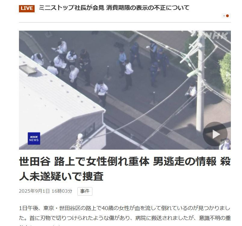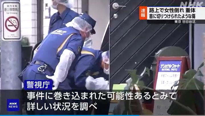 1일 오후, 도쿄 세타가야구의 한 주택가에서 피를 흘리며 쓰러져 있는 한국인 여성이 발견되었습니다. 그녀는 즉시 병원으로 이송되었으나 안타깝게도 사망하게 되었습니다. 피해자는 목에 자상으로 추정되는 상처를 입고 있었으며, 경찰은 20대에서 30대 남성이 범인으로 추정하고 있습니다. 사건 현장에서는 경찰이 집중적으로 수사를 진행하고 있습니다.