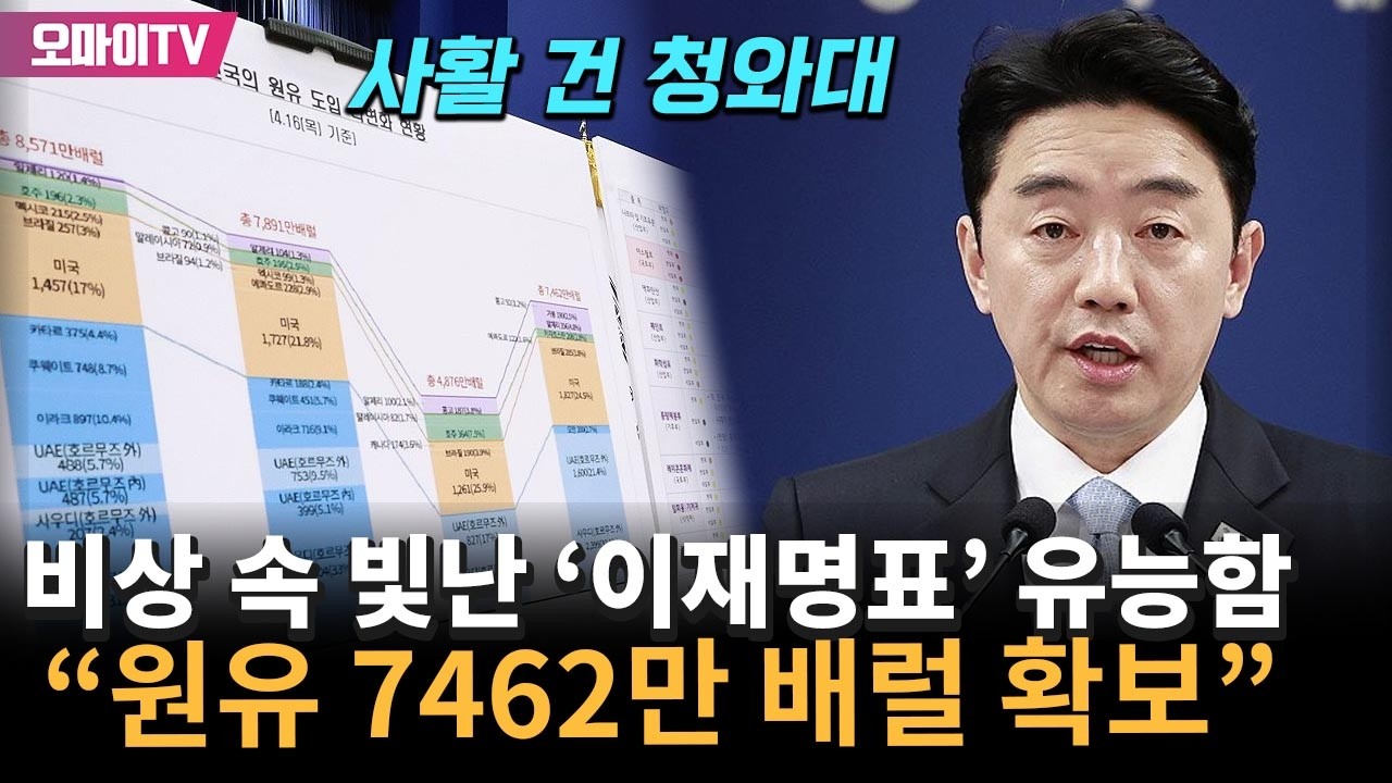 강훈식 비서실장은 5월 중에 7462만 배럴의 원유를 확보할 계획이라고 발표했습니다. 이는 국내 에너지 수급의 안정성을 높이는 데 기여할 것입니다. 이와 관련하여 그는 "이번 원유 확보는 국내 에너지 수급의 안정성을 높이는 중요한 조치"라고 강조했습니다.