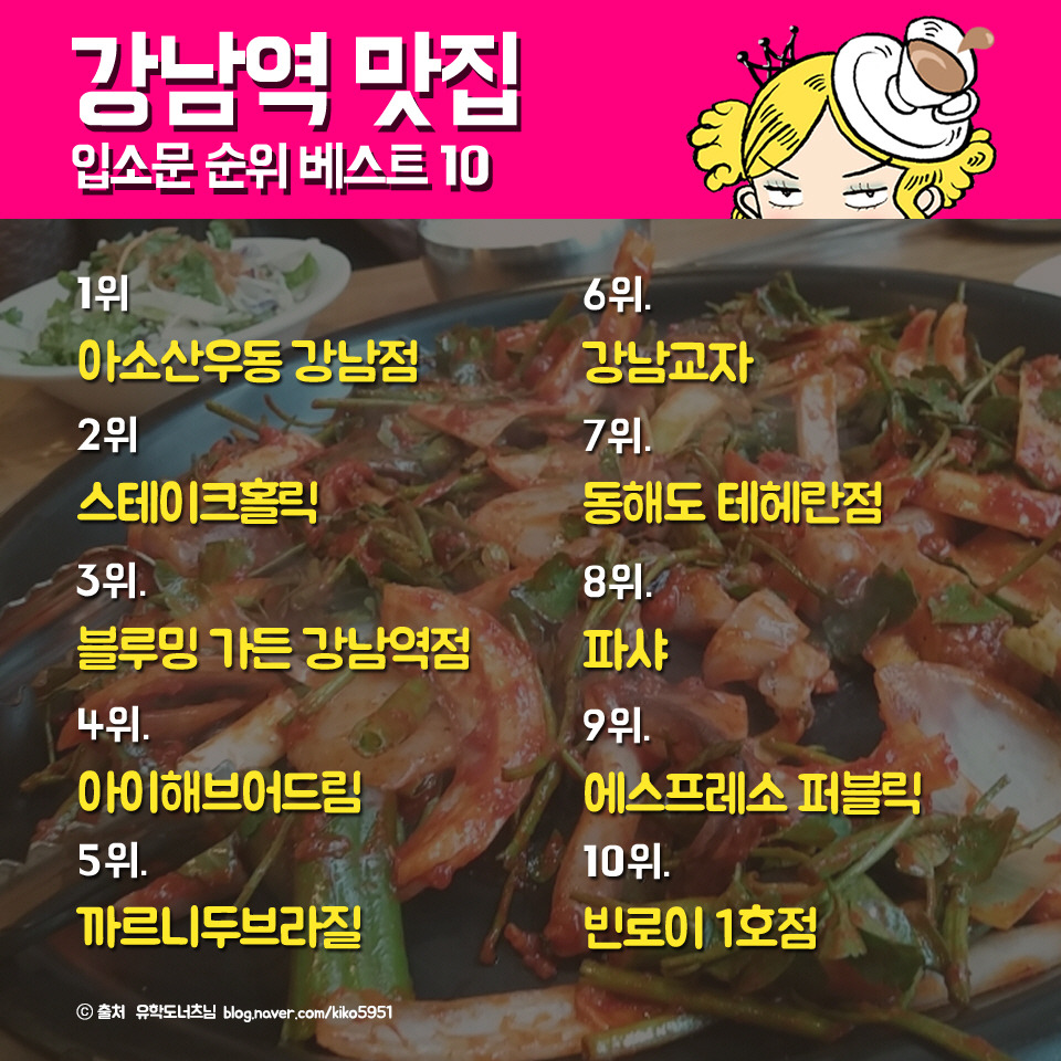 [4] NAVER - 강남역 근처 찐 맛집 리스트 내돈내산 TOP 7 (https://blog.naver.com/gminju_/223383962056?viewType=pc)