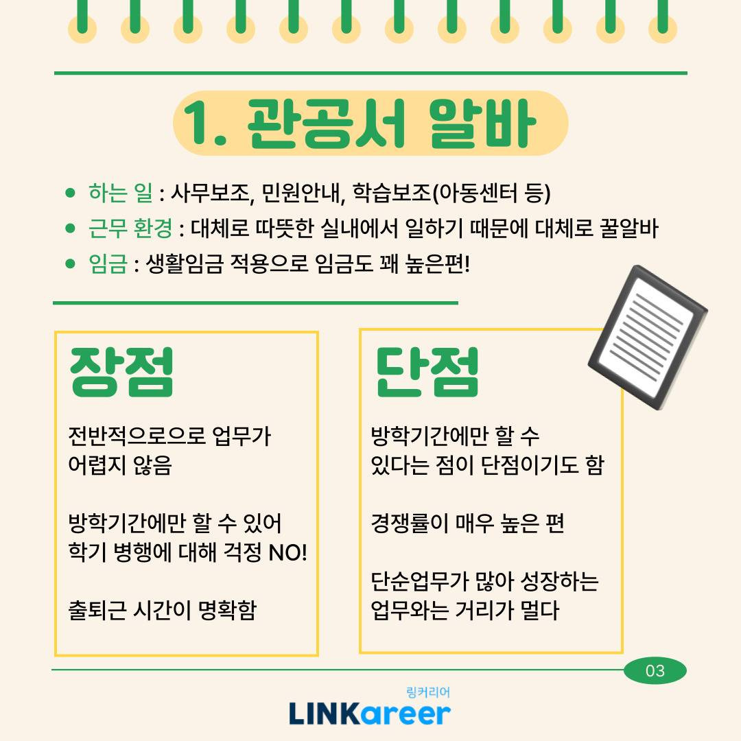 [1] 링커리어 - [겨울방학 꿀팁] 방학맞이 대학생 아르바이트 추천 리스트! (https://community.linkareer.com/honeytips/2472666)