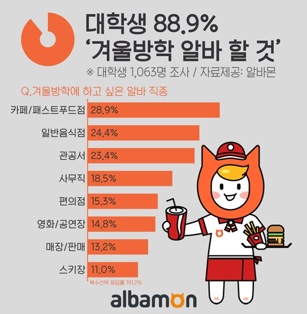 최근 조사에 따르면, 대학생들의 88.9%가 겨울 방학 동안 아르바이트를 하고 싶어한다고 합니다. 이들은 주로 카페/패스트푸드(28.9%), 일반 식당(24.4%), 관광(23.4%), 사무직(18.5%) 등의 분야에서 일하고 싶어합니다.