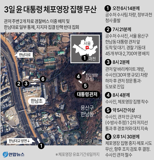 [4] 매일경제 - 경호처·군인에 가로막혀 '尹체포' 무산…공수처, 주말 집행 재 ... (https://www.mk.co.kr/news/society/11209485)