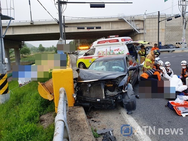 에서 보듯이, 승용차는 심하게 파손되어 도로에 뒤집혀 있었고, 주변에는 파편들이 흩어져 있었습니다. 응급 구조대원들이 현장에 도착하여 피해자들을 구조하고 있는 모습이 인상적이었습니다.