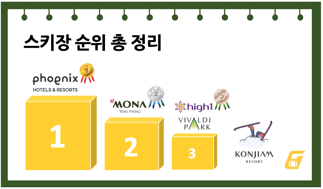 휘닉스 파크가 1위를 차지하며, 알펜시아 리조트와 비발디파크가 뒤를 이었습니다. 휘닉스 파크는 다양한 슬로프와 현대적인 시설로 많은 사랑을 받고 있습니다.