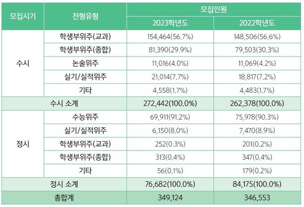 에서는 2023년과 2022년의 지원자 수를 비교한 표를 확인할 수 있어요. 수시와 정시의 지원자 수가 어떻게 변화했는지 살펴보면, 수시의 인기가 더욱 높아지고 있다는 것을 알 수 있어요.