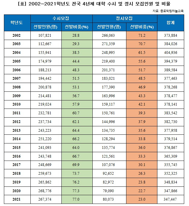 에서는 2002년부터 2021년까지의 수시와 정시의 학생 수를 비교한 표를 확인할 수 있어요.