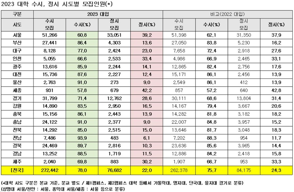 에서 볼 수 있듯이, 수시의 비율이 점점 증가하고 있는 추세예요. 특히 서울, 부산, 대구와 같은 주요 지역에서 수시 지원자가 늘어나고 있죠.
