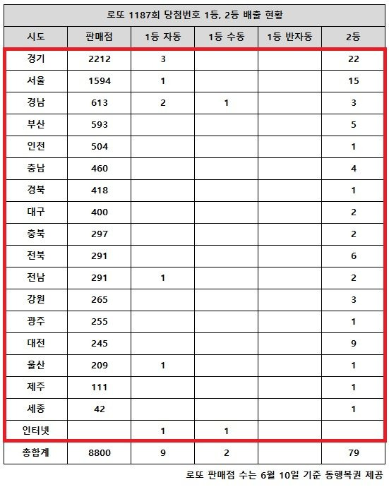 로또는 전국적으로 판매되고 있으며, 각 지역별로 당첨자 수와 판매 현황이 다릅니다. 이번 1187회 로또의 경우, 총 8,800개 의 판매점에서 판매가 이루어졌습니다.