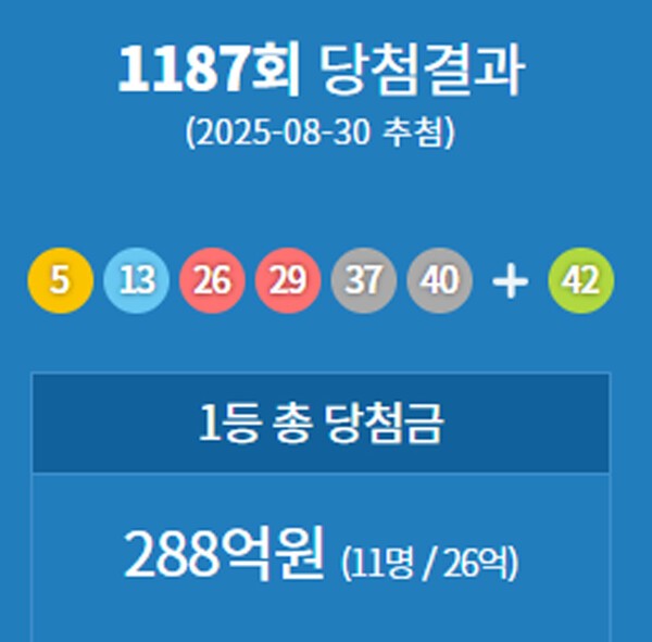 이번 1187회 로또의 당첨번호는 다음과 같습니다: 5, 13, 26, 29, 37, 40 입니다. 보너스 번호는 42 입니다.