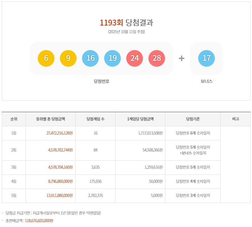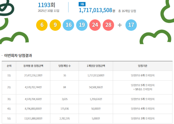 [1] 경향신문 - 1193회 로또 1등 '6, 9, 16, 19, 24, 28'···당첨금 17억 (https://www.khan.co.kr/article/202510112054001)