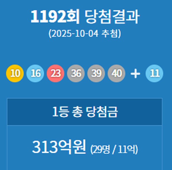 1192회 로또의 당첨번호는 10, 16, 23, 36, 39, 40 였으며, 보너스 번호는 11 이었습니다.