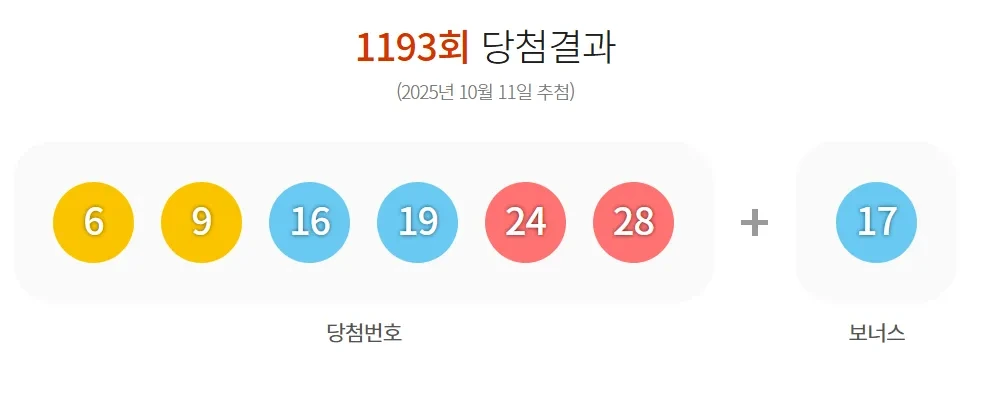2025년 10월 11일에 진행된 제 1193회 로또의 당첨번호는 6, 9, 16, 19, 24, 28 입니다. 보너스 번호는 17 입니다.