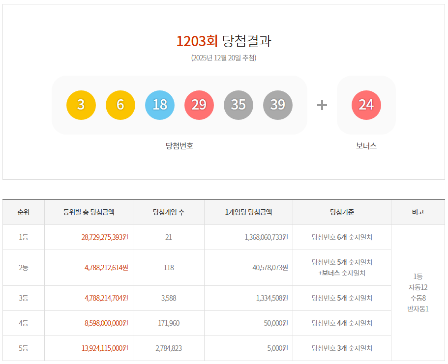 [4] 경기일보 - 1203회 로또 1등 21명…당첨금 13억7천만원씩 (https://www.kyeonggi.com/article/20251220580096)
