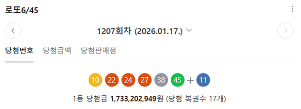 [4] 마켓인 - 1207회 로또 1등 17명…한 사람당 17.3억 - 마켓인 (https://marketin.edaily.co.kr/News/ReadE?newsId=01968006645318704)
