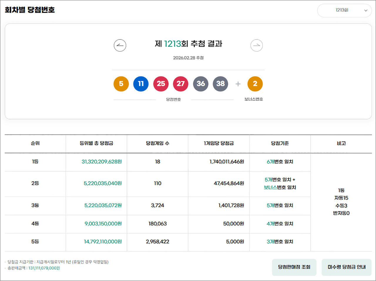 [1] mt.co.kr - 한 명당 '17억' 대박…로또 1213회 1등 '18명' 배출 지역 살펴보니 (https://www.mt.co.kr/society/2026/02/28/2026022821245356803)