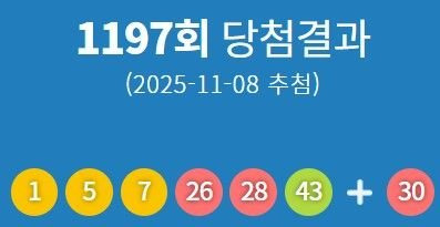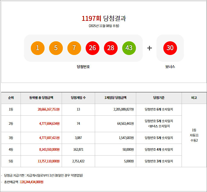 이번 1197회 로또의 당첨번호는 1, 5, 7, 26, 28, 43 이며, 보너스 번호는 30 입니다. 많은 분들이 이 번호를 확인하고 기대에 부풀어 계셨을 것 같습니다.