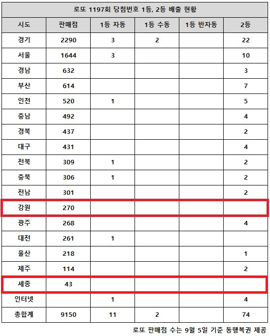 이번 로또 1197회에서 당첨자들이 구매한 지역은 다양합니다. 특히 서울 과 경기 지역에서 많은 당첨자가 나왔습니다. 아래의 표를 통해 각 지역별 판매점과 당첨자 수를 확인해 보세요.