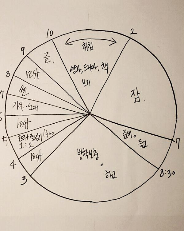 시간표는 일반적으로 주간 또는 일일 단위로 구성됩니다. 각 시간대에 어떤 활동을 할지 정하고, 공부 시간, 휴식 시간, 취미 시간 등을 균형 있게 배분해야 합니다. 아래의 예시 이미지처럼 원형으로 나누어 시간표를 짜면 시각적으로도 분명하게 구분할 수 있습니다.