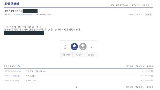 [4] 동아일보 - “기흥역에 폭탄 숨겨뒀다”…테러 암시 글에 경찰 수색 나서 (https://www.donga.com/news/Society/article/all/20250423/131474961/2)