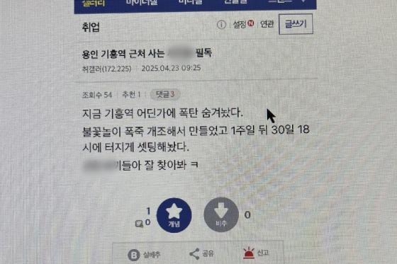 [3] 헤럴드경제 - “30일 오후6시에 터지게 세팅” 용인 기흥역 폭탄 테러 예고 글 ... (https://biz.heraldcorp.com/article/10472070)