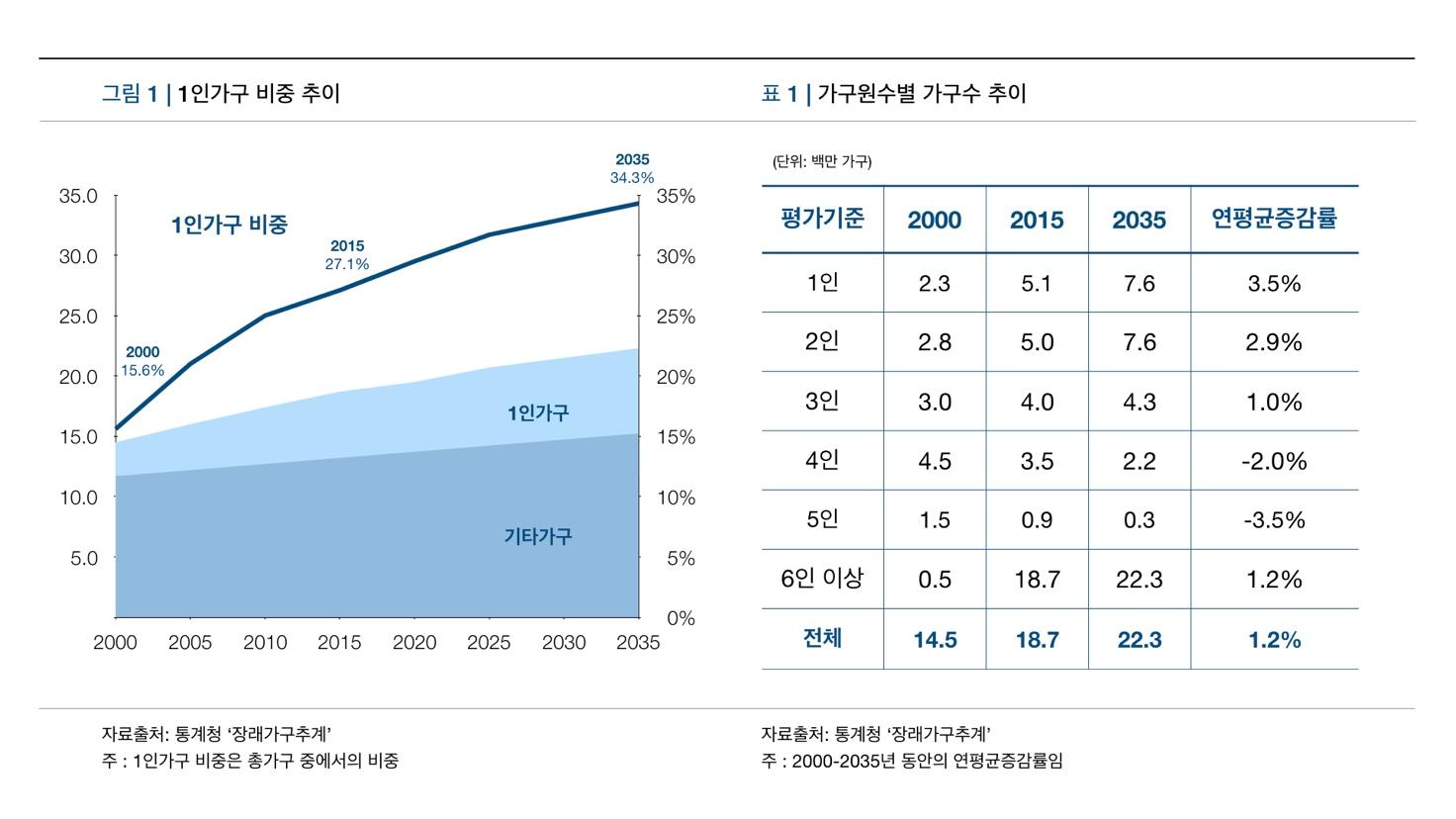 한국의 1인 가구는 2000년대 초반부터 꾸준히 증가해왔습니다. 2020년에는 전체 가구의 34.5%가 1인 가구로, 2035년에는 이 비율이 34.3%에 이를 것으로 예상됩니다.