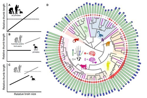 영장류의 진화 과정에서 엄지손가락은 중요한 역할을 해왔습니다. 엄지손가락이 길고 강한 영장류는 도구를 사용하고, 복잡한 작업을 수행하는 데 유리합니다. 연구팀은 엄지손가락의 길이와 뇌 크기 간의 관계를 그래프로 나타내어, 이 두 요소가 함께 진화해왔음을 보여주었습니다.