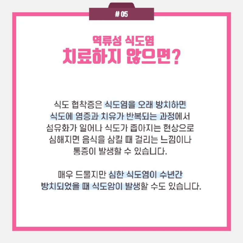 치료하지 않고 방치할 경우, 역류성 식도염은 여러 합병증을 유발할 수 있습니다. 예를 들어, 식도염이 심해지면 식도에 궤양이 생기거나, 심한 경우에는 식도암으로 발전할 수 있습니다. 따라서 증상이 나타나면 즉시 치료를 받는 것이 중요합니다.