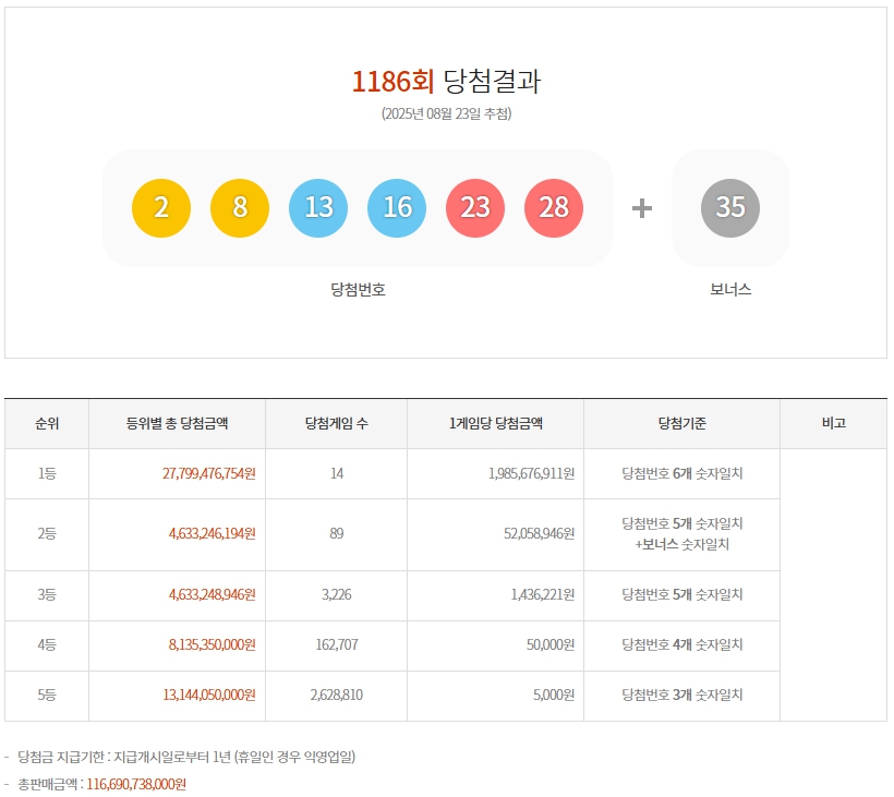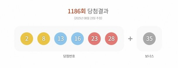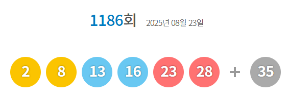 [4] 한국경제TV - 1186회 로또 1등 '2, 8, 13, 16, 23, 28' (https://www.wowtv.co.kr/NewsCenter/News/Read?articleId=AKR20250823054100002)