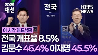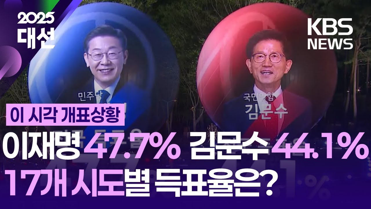 [4] KBS 뉴스 - [개표방송] 이재명 47.7%, 김문수 44.1% 이 시각 지역별 ... (https://news.kbs.co.kr/news/view.do?ncd=8271021)