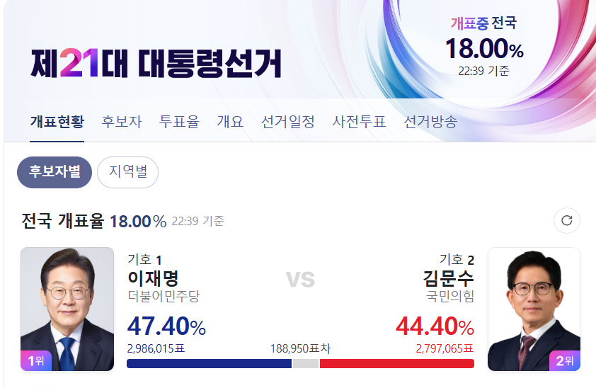 2025년 대한민국 대선이 마무리되었습니다. 이번 대선에서는 더불어민주당의 이재명 후보가 49.42%의 득표율로 당선되었고, 국민의힘의 김문수 후보는 41.15%를 기록했습니다. 이준석 후보는 8.34%의 득표율을 보였습니다. 이번 포스팅에서는 대선 개표 결과를 분석하고, 각 후보의 전략과 유권자 반응을 살펴보겠습니다.
