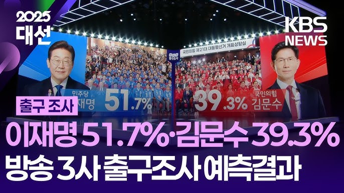 [3] YouTube · KBS News - [LIVE][4원 생중계] 방송3사 출구조사…이재명 51.7%, 김문수 ... (https://www.youtube.com/watch?v=1oBhqkGTRpM)