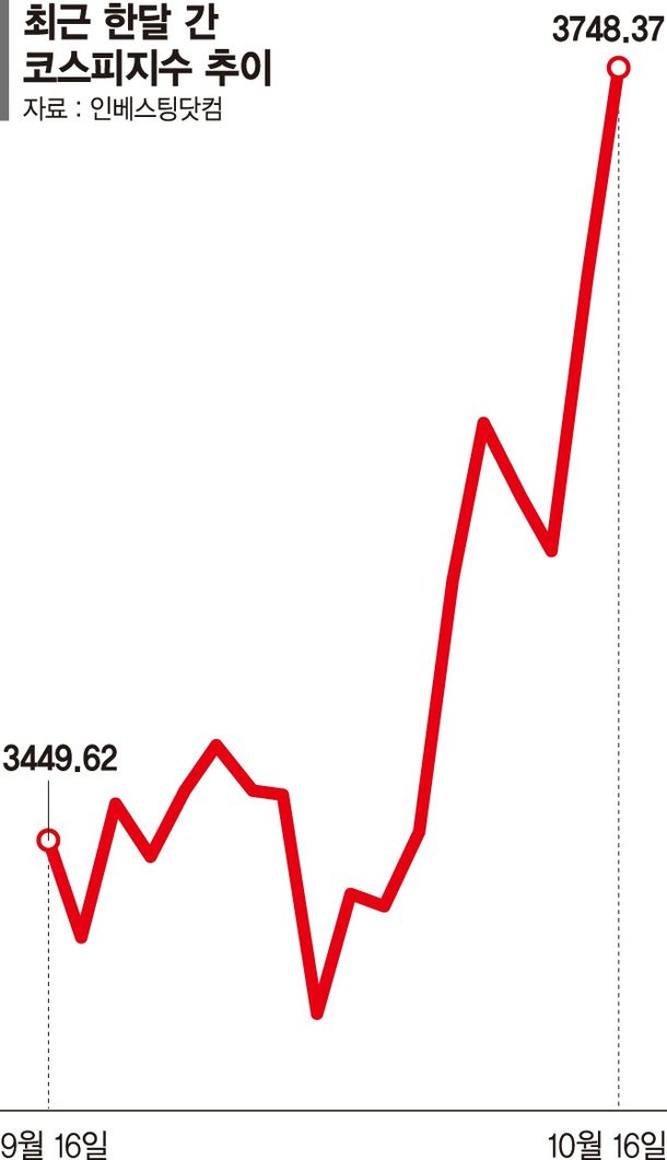 이 그래프는 최근 코스피의 상승세를 보여주며, 9월 16일 3,449.62에서 10월 16일에는 3,748.37로 급등한 모습을 확인할 수 있습니다.