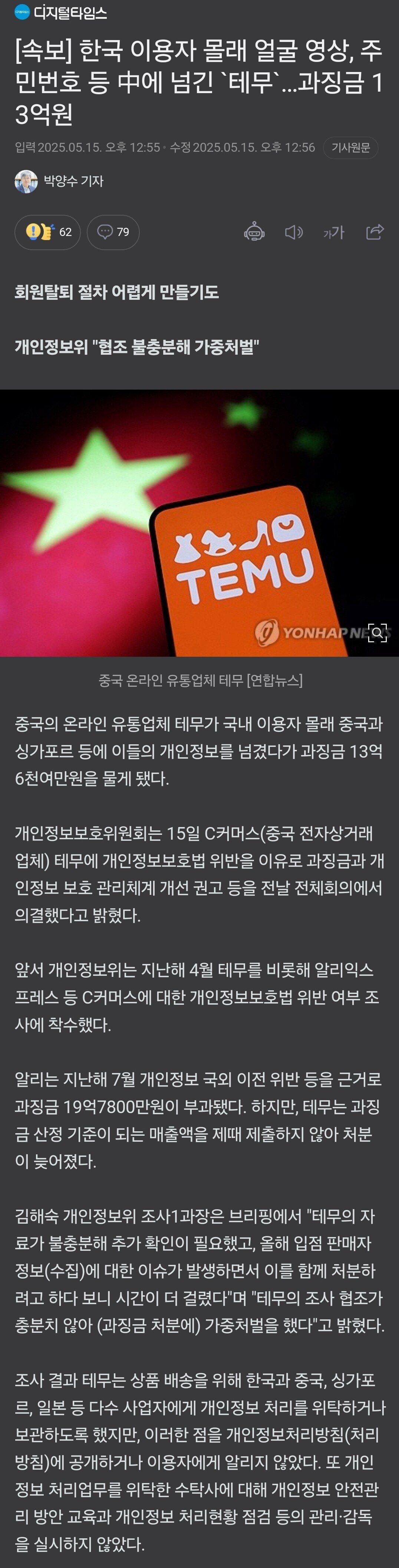 [1] 연합뉴스 - 韓이용자 몰래 중국 등에 개인정보 넘긴 '테무'…과징금 13억원 (https://www.yna.co.kr/view/AKR20250515073400530)