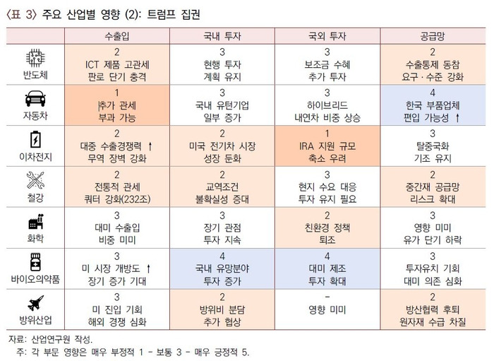 트럼프의 정책은 한국의 여러 산업에 다양한 영향을 미칠 것으로 보입니다. 자동차, 전자, 바이오 등 주요 산업별로 분석해보면 다음과 같습니다.
