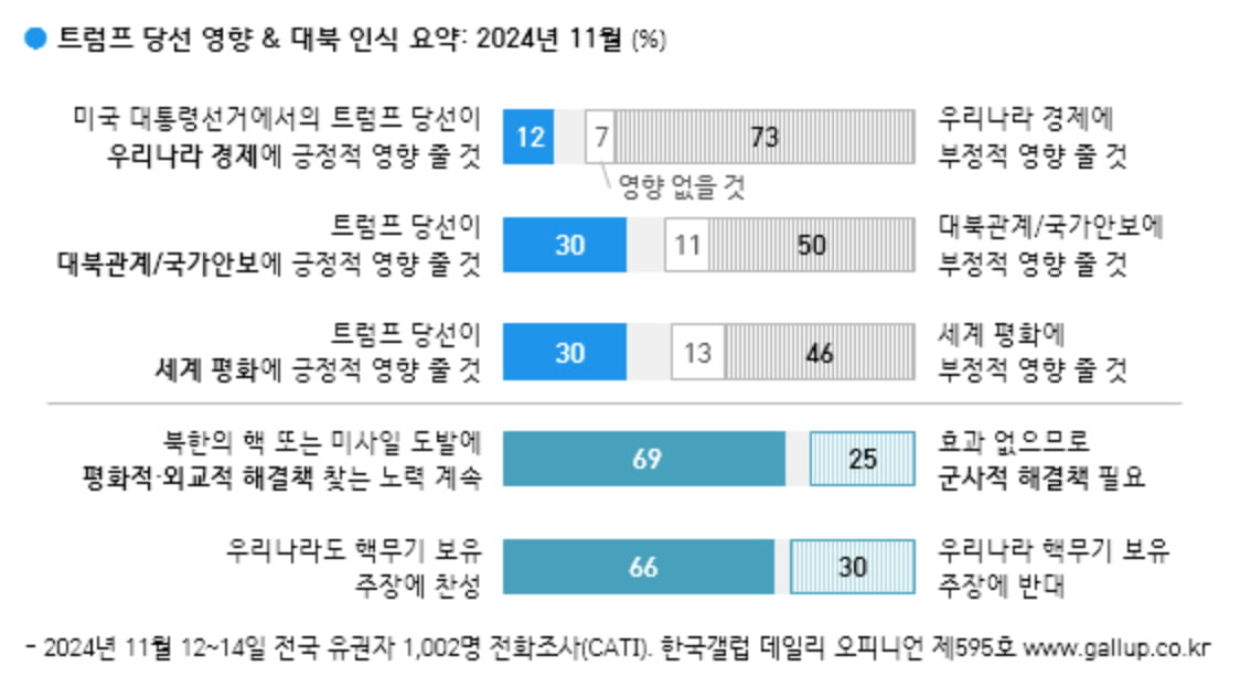 여론 조사에 따르면, 트럼프의 당선이 한국 경제에 미치는 영향에 대해 부정적인 시각이 지배적입니다. 조사 결과, 73%의 응답자가 트럼프의 당선이 한국 경제에 부정적인 영향을 미칠 것이라고 응답했습니다.