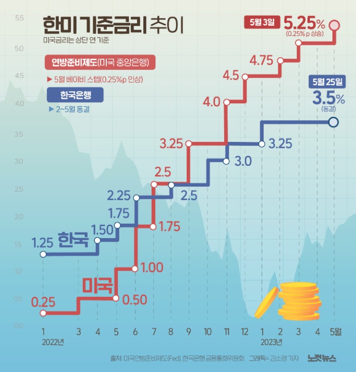 한국의 기준금리 동결은 미국과의 금리 차이와도 관련이 있습니다. 미국은 최근 금리를 인상하는 추세에 있으며, 이는 한국 경제에 직접적인 영향을 미치고 있습니다.
