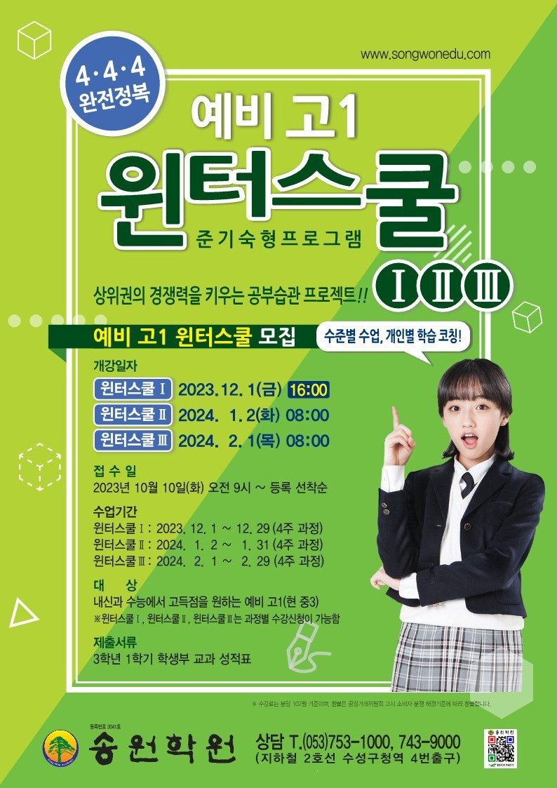 윈터스쿨 프로그램은 다양한 과목을 포함하고 있으며, 특히 수학, 과학, 영어 등 주요 과목에 집중합니다. 프로그램은 일반적으로 4주에서 6주 정도 진행되며, 매일 정해진 시간에 수업이 이루어집니다. 또한, 수업 후에는 복습 및 추가 학습을 위한 자율 학습 시간이 제공됩니다.