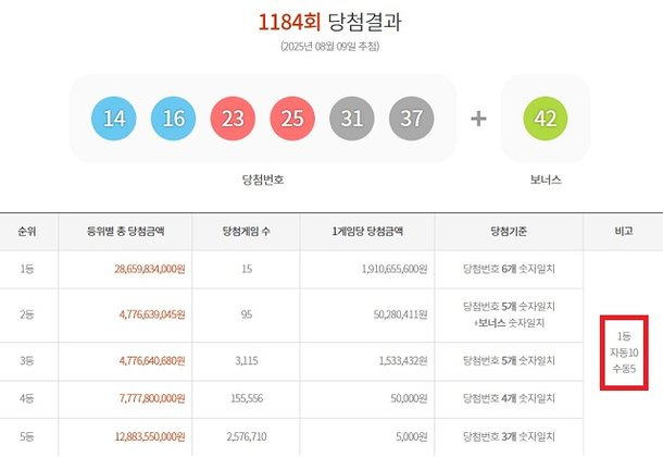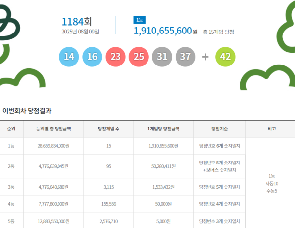 [3] 네이트 - 1184회 로또 1등 각 19억원씩…자동 10명·수동 5명(종합) (https://news.nate.com/view/20250809n10366)
