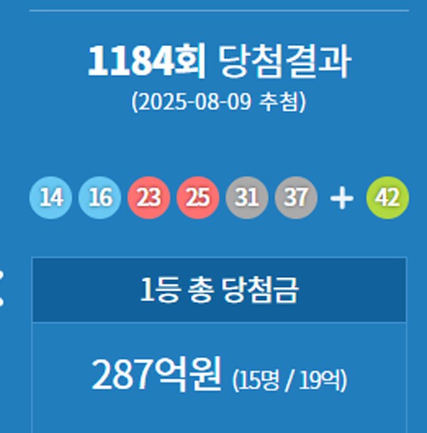 [2] 경향신문 - 1184회 로또 1등 '14, 16, 23, 25, 31, 37' (https://www.khan.co.kr/article/202508092055001)