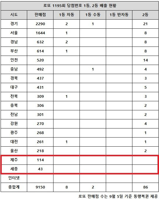 예를 들어, 제주도에서는 114개의 판매 포인트가 있었고, 1등 당첨자가 1명 나왔습니다. 반면, 세종시는 43개의 판매 포인트가 있었지만 1등 당첨자는 없었습니다. 이러한 지역별 판매 현황은 로또 구매 시 참고할 만한 정보입니다.