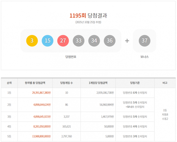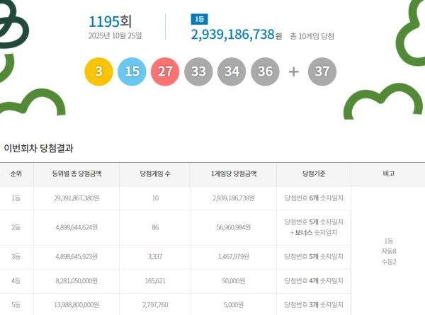 [2] 국제신문 - 1195회 로또 복권 1등 10명…당첨금 각 29억 3918만 원씩 (https://www.kookje.co.kr/news2011/asp/newsbody.asp?code=0200&key=20251025.99099006279)
