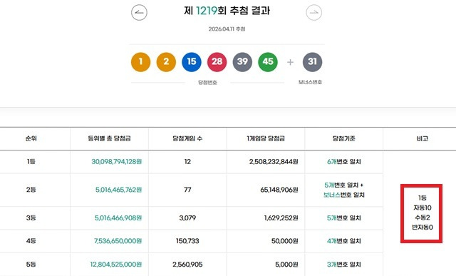 [4] 장애인인식개선신문 - 로또 1219회 1등 당첨번호 조회···'1등 12명 중 자동 10명' (https://m.dpi1004.com/a.html?uid=13468)