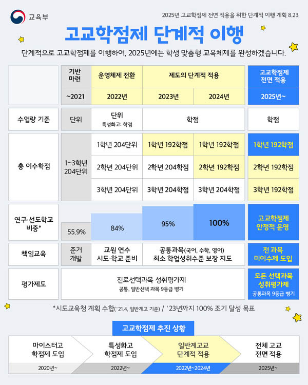 이 과정에서 학생들은 점진적으로 새로운 시스템에 적응하게 될 것입니다. 각 학년별로 필요한 학점 수와 평가 방법이 다르게 설정되어 있어, 학생들은 자신의 학습 스타일에 맞춰 계획을 세울 수 있습니다.