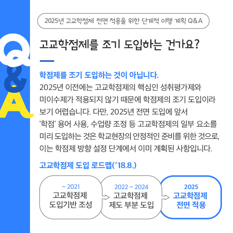 고교학점제는 2025년부터 시행될 예정으로, 학생들이 원하는 과목을 선택하여 이수할 수 있는 시스템입니다. 이는 학생 개개인의 흥미와 진로에 맞춘 교육을 제공하기 위한 노력의 일환으로, 교육의 질을 높이고 학생들의 자율성을 증대시키는 데 기여할 것입니다.