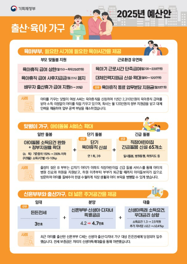 가족을 위한 다양한 지원금이 마련되어 있습니다. 특히, 자녀를 양육하는 가구에 대한 육아 지원금이 확대될 예정입니다. 정부는 부모의 육아 부담을 줄이고, 일과 가정의 균형을 맞출 수 있도록 다양한 프로그램을 운영할 것입니다.