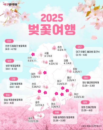 2025년 벚꽃 시즌에는 여러 축제가 열립니다. 여의도 벚꽃축제는 4월 1일부터 4일까지 열리며, 경주 벚꽃축제는 4월 6일부터 시작됩니다. 자세한 일정은 다음 이미지를 통해 확인하세요.