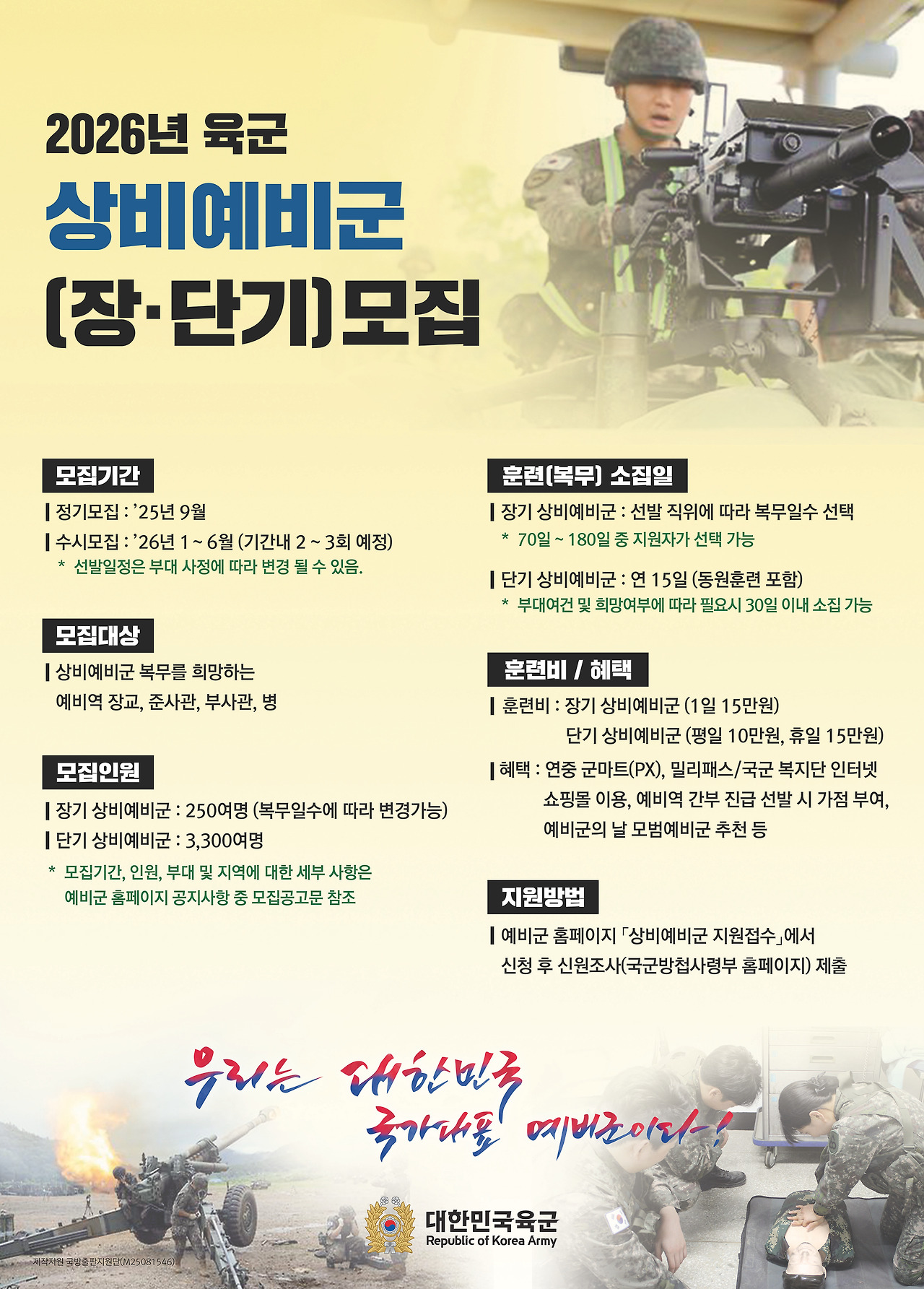 [4] 국방신문 - 국방부, 2026년도 상비예비군 정기모집 (https://www.gukbangnews.com/news/articleView.html?idxno=10180)